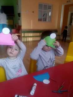 И тъй като апликирането е една от любимите им дейности , те с нетърпение се заловиха за работа и си направиха от хартия, памук и лепило красиви, цветни шапчици.