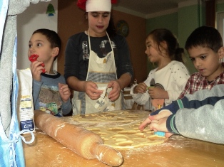 Една от спирките в коледната въртележка бе „Коледната пекарна”- тук децата изрязваха и опекоха сладки от тесто и сладко-сладко си похапнаха.