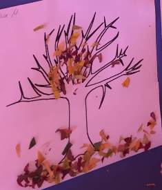 Запретнаха ръкави и с въодушевление се захванаха за работа, пресъздавайки красотата на сезона чрез апликация "Есенно дърво". Малчуганите грижливо избираха най-красивите листа, внимателно ги изрязваха в различни форми и прецизно ги залепяха върху клоните на своето дърво. Те проявиха креативност и лично отношение при подбора на формите, цветовете и разположението, като следваха индивидуалните си предпочитания и вътрешния си усет. Подреждайки лист по лист, децата със задоволство наблюдаваха как творбите им се превръщат постъпенно в истинско олицетворение на есенната красота. Положителните емоции по време на творческата дейност обогатиха детската душевност, изградиха усет към съчетаването на цветовете и изящните форми в природата.