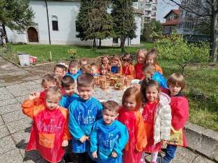 На 28 април децата изработиха страхотни пиленца за празничната трапеза, с които приятно изненадаха своите родители. На Велики четвъртък, най - важният ден от Страстната седмица малчуганите изпревариха своите баби и първи боядисаха яйцата за Великден в зеления двор на храма „Св. вмчк Димитър Солунски“. Пъстрото яйце е емблемата на празника и повод за премерване на силите, затова приятните емоции и веселите усмивки бяха в изобилие. Архиерейският наместник на Кюстендилска духовна околия архимандрит Исаак поздрави децата, разказа им за символиката при боядисването на яйцата и ги зарадва с подаръци. Един прекрасен завършек на празника беше невероятната фотосесия, която децата подариха на своите родители и пожелаха на всички светли Великденски празници, мир и любов в сърцата, здраве и благоденствие.