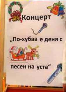 Проведеният концерт под наслов: "По - хубав е деня с песен на уста" е дейност по реализиране на проект „ Равни възможности за малцинствата и уязвимите групи-преодоляване на негативните стереотипи и подкрепа за личностно развитие“, разработен от община Кюстендил, в който участва нашата детска градина.
