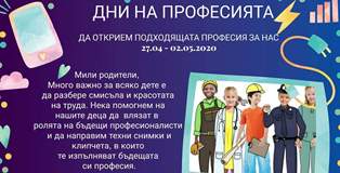 Дни на професиите под мотото: „ Да открием подходящата професия за нас“ се проведоха от 27.04 до 2.05.2020 г в ДГ „Слънце“ гр.Кюстендил.Тази инициатива е част от дейностите на детската градина, с които се цели подпомагане на кариерното ориентиране и насърчаване на бъдещия съзнателен избор на професия у децата.