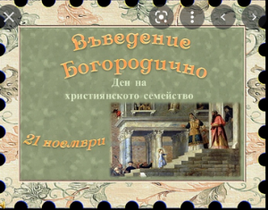 На 21 ноември Светата Православна Църква чества празника Въведение Богородично. Този ден църквата е приела и за Ден на християнското семейство. По случай празника, децата от група "Славейче" се премениха в красиви носии и заедно приготвиха баница.