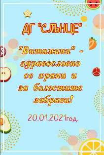 На 20.01.2021 г. в ДГ „Слънце“ се проведе тематичен ден посветен на здравословното хранене. Децата от всички групи на ДГ се включиха в приготвянето на здравословни десерти, витаминозни салати, смутита, шейкове, прясно изцедени сокове от цитрусови плодове, красиво аранжирани плата от различни по вкус и цвят плодове.