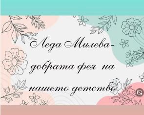 Леда Милева - поет, преводач, деятел на културата, обществен деец, дипломат и дъщеря на поета Гео Милев. Поколения наред са израснали с нейните песнички и стихове, откривали са магията на римуваното слово, написано с толкова голяма любов към децата. През 1998 г. учители и деца от ДГ „Слънце“са имали честта да я посрещнат в детската градина и да се насладят на обаятелното и присъствие.