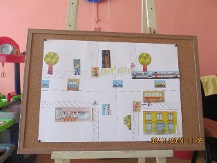 Специално подготвените табла и многото нагледни пособия в занималнята, спомагат децата лесно да се ориентират в улична ситуация и правилно да изберат вярното решение. Особено занимателно се оказва направата на определена ситуация на улицата – децата сами определят местата на МПС, пешеходците, светофарите, пешеходните пътеки и пр.