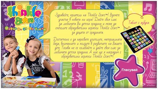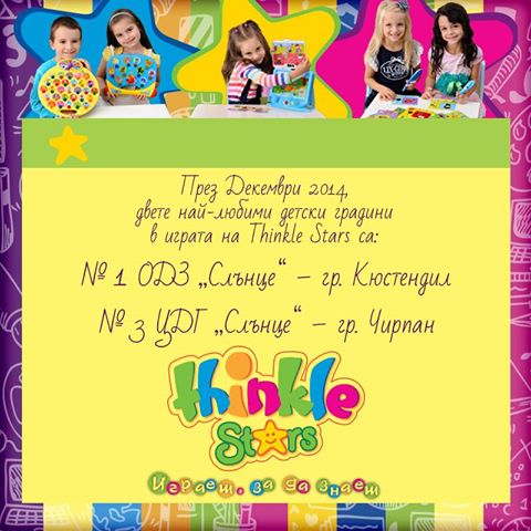 Известни са резултатите от играта за месец декември 2014 година.С радост и гордост приемаме наградата, а именно: двете любими детски градини в играта на Тhinkle Stars са 1 ОДЗ „Слънце“ в град Кюстендил и 3 ЦДГ „Слънце“ в град Чирпан. Пожелаваме на децата от градините победители много забавни и весели игри с образователни играчки Thinkle Stars™!