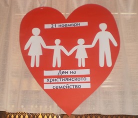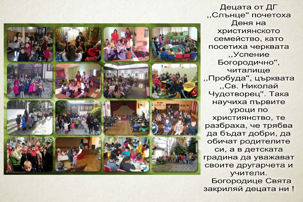 Госпожата по религия Христина Петрова разказа интересни неща за светлия празник.Децата от група "Синчец" и от група "Слънце" бяха на посещение в читалище "Пробуда", гр. Кюстендил.Децата от групите "Зайче", "Лъвчета", "Славейче" и "Кокиче" почетоха Деня на християнското семейство, като посетиха черквата "Успение Богородично", а в килийното училище гледаха филмче за семейството. С тези първи уроци по християнство те разбраха, че трябва да бъдат добри, да обичат родителите си, а в детската градина да уважават своите другарчета и учители. Малчуганите от яслена група "Гъбка" като истинско семейство се събраха на питка в битова обстановка.