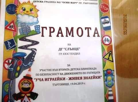 В навечерието на 24 май - Ден на българската просвета и култура и на славянската писменост ДГ "Слънце" получи грамота за участие на нейните малки възпитаници във втората детска олимпиада по безопасност на движението по пътищата " Уча играейки - живея знаейки."
