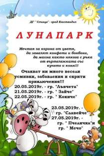 С тези думи цветният и пъстър афиш поставен на вратата на детската градина отправяше покана към всички деца да участват в едно от най - атрактивните забавления на детската градина в дните от 20.05.2019 г. до 28.05.2019 година. През този период дворът на детската градина се превърна в същински весел лунапарк. Всяка група се забавляваше с различни интересни игри и атракции. Топки, балони, коли и камиони, тротинетки, колелета, кончета, мечета - всичко това гарнирано с много смях, музика и веселие направи малчуганите истински щастливи. Най - малките дечица от яслените групи "Гъбка" и "Мечо" запленени и очаровани от цветните забавления трудно се разделяха с тях и искаха този шарен лунапарк да не си отива.