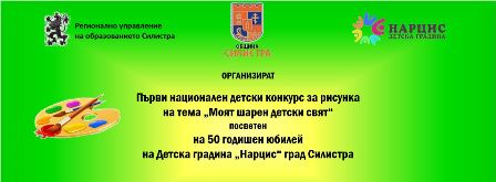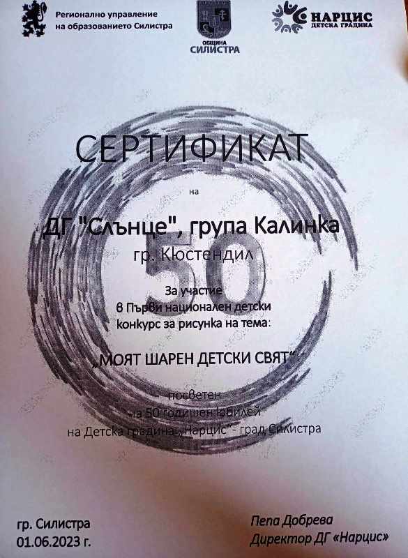 Деца от група "Калинка" на ДГ "Слънце" участваха в Първия национален конкурс за рисунка на тема "Моят шарен детски свят", посветен на 50 годишния юбилей на детска градина "Нарцис", град Силистра.