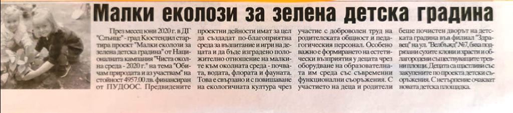 През месец юни 2020г. в ДГ „Слънце“, град Кюстендил стартира проект „Малки еколози за зелена детска градина“ от Националната кампания „Чиста околна среда - 2020 г.“ на тема: „Обичам природата и аз участвам“.Предвидените проектни дейности имат за цел да създадат по - благоприятна среда за възпитание и игри на децата и да бъде изградено положително отношение на малките към околната среда - почвата, водата, флората и фауната. Това е свързано и с повишаване на екологичната култура, чрез участие с доброволен труд на родителската общност и педагогическия персонал.